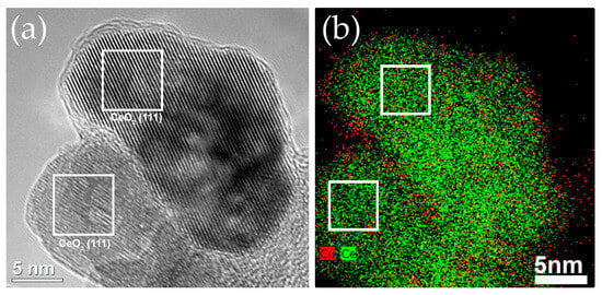 Cu(L)–CeO2 composite behavior under electron beam irradiation. (a) An HRTEM image and (b) EDX-mapping, 10 min irradiation.