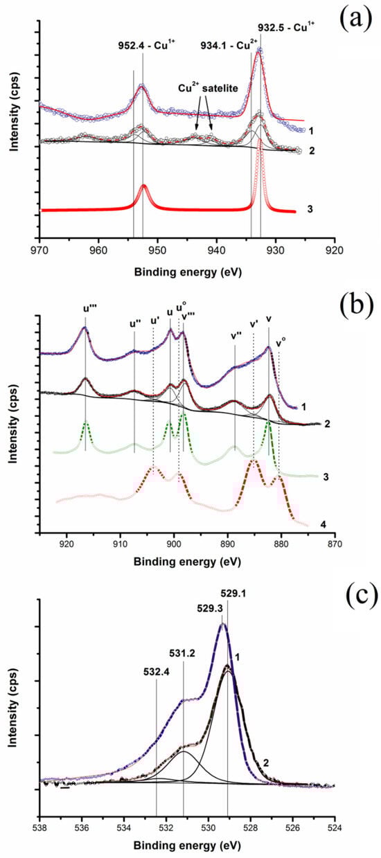 XPS spectra of Cu(D)–CeO2 and Cu(L)–CeO2 powders. (a) Cu 2p: 1—Cu(D)–CeO2, 2—Cu(L)–CeO2, 3—Cu2O as a reference spectrum; (b) Ce 3d: 1—Cu(D)–CeO2, 2—Cu(L)–CeO2, 3—CeO2, 4—Ce2O3 as a reference spectrum (v, v″, v‴ peaks are attributed to 3d5/2 CeO2 photoemission lines; v and v″ correspond with the mixed configurations of (5d 6s)0 4f2 O 2p4 and (5d 6s)0 4f1 O 2p5; v‴ corresponds to the (5d 6s)0 4f0 O 2p6 configuration in the terminal state of the system; v0 and v’ are attributed to the (5d 6s)0 4f2 O 2p4 and (5d 6s)0 4f1 O 2p5 configurations in Ce2O3; lines u0 … u‴ appear due to spin-orbit splitting (Ce 3d3/2 line) and can be described in a similar way [38,39]); (c) O 1s: 1—Cu(D)–CeO2, 2—Cu(L)–CeO2.