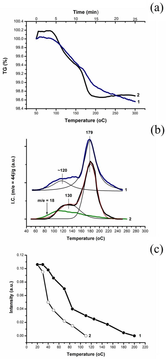 CO–TPR curves for 1—Cu(D)–CeO2 and 2—Cu(L)–CeO2 catalysts. (a) TG; (b) MS (m/e = 44, CO2 and m/e = 18, H2O) signal versus temperature, MS signal intensity was normalized to the sample weight; (c) corresponding FTIR measurements for Cu(L)–CeO2 catalysts. Change in the intensity of the absorption band at 1630 cm−1 (δ H-O in H2O) under the heating in 1 is pure He, and in 2 is a mixture of 10 vol.% CO/He.