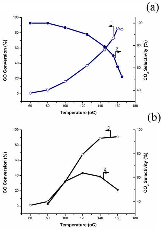 Temperature dependence of 1—CO conversion and 2—CO2 selectivity. (a) Cu(D)–CeO2, and (b) Cu(L)–CeO2. Reaction mixture: H2:CO:O2 (98:1:1, vol.%).