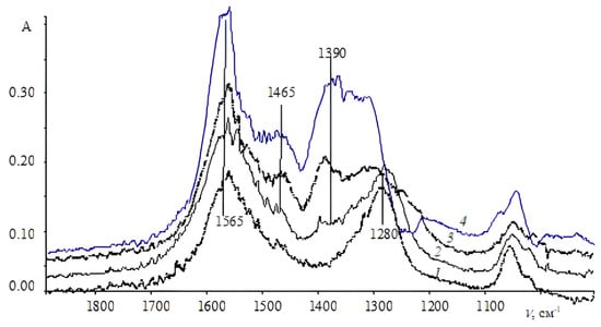 Operando FTIR spectra recorded at different temperatures for Cu(L)–CeO2 catalyst under 1 vol.% CO/He flow: 1—30 °C, 2—70 °C, 3—150 °C, and 4—200 °C.