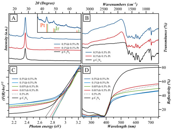 (A) XRD patterns of the Pt0.5Ir0.5/C3N4(1) and Pt0.1Ir0.1/C3N4(1) catalysts and g-C3N4; (B) FTIR spectra of the Pt0.5Ir0.5/C3N4(1), Pt0.1Ir0.1/C3N4(1), and g-C3N4; (C) Tauc plots performed for the Pt0.5Iry/C3N4(1) series of catalysts, Pt0.5/C3N4(1), and g-C3N4; and (D) DRS of the Pt0.5Iry/C3N4(1) series of catalysts, Pt0.5/C3N4(1) and g-C3N4.