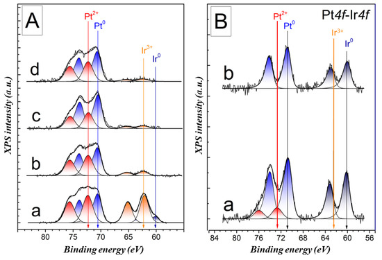 (A) Pt4f and Ir4f regions of the XPS spectra of the Pt0.5Iry/C3N4(1) series of catalysts (y = 0.5, 0.1, 0.05, and 0.01 for curves a, b, c, and d correspondingly); and (B) XPS spectra in the same region recorded for the catalysts Pt0.5Ir0.5/C3N4(2) (a) and Pt0.5Ir0.5/C3N4(3) (b).