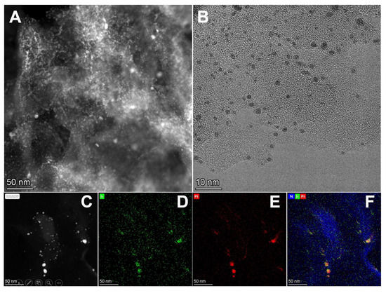 For comparison, Figure 4 shows TEM images with elemental mapping of the photocatalyst Ir0.5Pt0.5/g-C3N4(2), which has the same metal content, but prepared by Method 2. For this sample, elemental mapping shows the formation of large bimetallic Pt-Ir particles up to 10 nm in size. This confirms the alloying of Pt and Ir under hydrogen treatment at 400 °C used in the synthesis by Method 2.