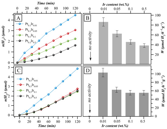 The next step of the work was to study the effect of the content of iridium and platinum in the samples prepared by Method 1 on the activity in the evolution of hydrogen from pure water. Typical kinetics of hydrogen evolution over bimetallic photocatalysts prepared by Method 1 are shown in Figure 5A,C. The net activities are represented in Table 3 and Figure 5B,D. One can see that the kinetics of hydrogen formation for all the catalysts are linear over 2 h. At that, among photocatalysts Pt0.5Iry/C3N4(1) and Pt0.1Iry/C3N4(1), the maximum rate of hydrogen evolution is about the same, which certainly makes photocatalysts with 0.1% Pt more cost-efficient.