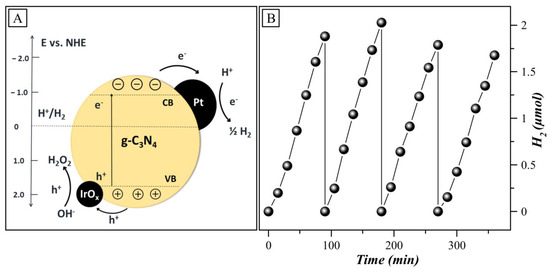 (A) Diagram for the proposed mechanism of the H2 and H2O2 generation from water by a visible-light irradiated PtxIry/C3N4 photocatalysts; and (B) the cyclic tests of the H2 generation from the ultrapure water with the Pt0.1Iry/C3N4 photocatalyst.