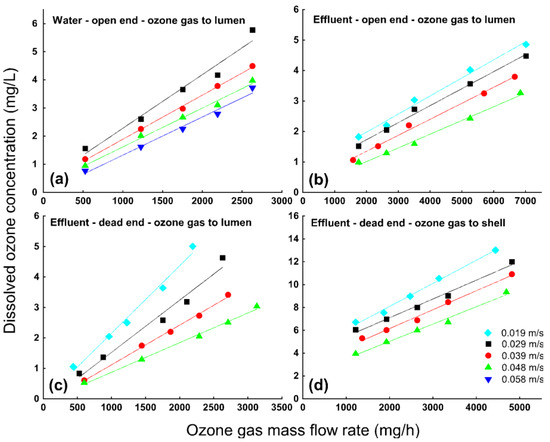 Dissolved ozone concentrations versus ozone gas mass flow rate for different liquid flow velocities. (a) Liquid phase: water; membrane operation: open-end; ozone gas introduction: into the membrane lumen. (b) Liquid phase: wastewater effluent; membrane operation: open-end; ozone gas introduction: into the membrane lumen. (c) Liquid phase: wastewater effluent; membrane operation: dead-end; ozone gas introduction: into the membrane lumen. (d) Liquid phase: wastewater effluent; membrane operation: dead-end; ozone gas introduction: into the membrane shell.