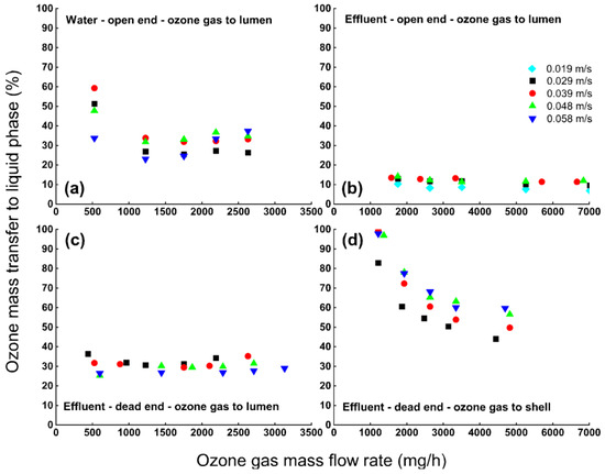 Ozone mass transfer to liquid phase (%) versus the ozone gas mass flow rate for different liquid flow velocities. (a) Liquid phase: water; membrane operation: open-end; ozone gas introduction: into the membrane lumen. (b) Liquid phase: wastewater effluent; membrane operation: open-end; ozone gas introduction: into the membrane lumen. (c) Liquid phase: wastewater effluent; membrane operation: dead-end; ozone gas introduction: into the membrane lumen. (d) Liquid phase: wastewater effluent; membrane operation: dead-end; ozone gas introduction: into the membrane shell.