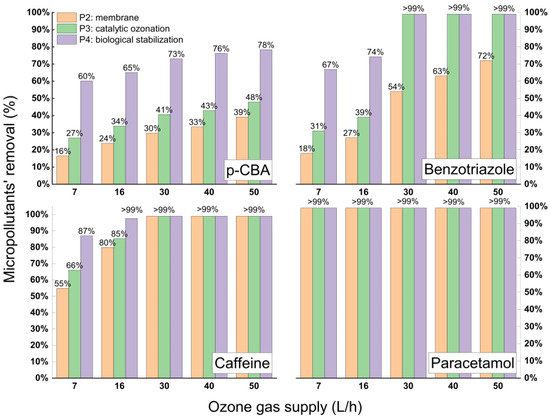 An increase in the efficiency of the unit, regarding p-CBA removal, was also noted with the increase in the ozone gas supply to the system (Figure 3 “p-CBA”). When applying a supply of 7 L/h, corresponding to a dissolved ozone production equal to that estimated to be developed in the existing ozonation unit of the “AINEIA” WWTP, the removal rate of p-CBA was 60%, while this percentage could reach almost 80% for a higher ozone gas supply (50 L/h). Given that p-CBA reacts mainly with hydroxyl radicals and not with ozone molecules, this removal is indicative of the ozone decomposition in the membrane and in the catalytic bed towards the production of hydroxyl radicals, which are much stronger oxidants than ozone. In the case of benzotriazole (Figure 3 “Benzotriazole”), which, unlike p-CBA, can be degraded by ozone molecules, the removal appeared to be significantly greater, especially for an ozone gas supply of 30 L/h and above, where its degradation through the application of catalytic ozonation was complete. Caffeine (Figure 3 “Caffeine”), with a constant reaction rate with ozone of kO3 = 650 M−1s−1 (i.e., 32.5 times greater than that of benzotriazole) was removed by 87% with an ozone gas supply to the membrane of 7 L/h, while an increase in this value resulted in a more than 99% MP degradation. Finally, paracetamol (Figure 3 “Paracetamol”), presenting a very high reaction rate constant with ozone, was already completely removed after the second treatment step of the unit (i.e., ozone dilution in the membrane), even with the application of the lowest ozone gas supply.