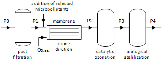 The evaluation of heterogenous catalytic ozonation was performed by using zeolite and PET as catalysts (materials that were found to present optimum performance in previous research) and p-CBA, benzotriazole, paracetamol, and caffeine as typical MPs. Both materials displayed a notable catalytic action that significantly contributed to the removal of MPs. In the case of p-CBA and for an ozone gas supply of 16 L/h, 25% of the added MP was degraded in the membrane module, during ozone dilution, and an additional 10% was degraded via catalytic ozonation, while a final treatment step of biological stabilization led to a more than 60% total degradation rate. The increase in the ozone gas supply to the unit resulted in significantly greater p-CBA removal rates, up to an average of 75% for the highest ozone gas supply examined (50 L/h). The degradation rates for benzotriazole ranged from 67% for zeolite application and 55% for PET, for an ozone gas supply of 7 L/h, to complete removal for 30 L/h and above. The complete degradation of caffeine was achieved with an ozone gas supply of 16 L/h, while for the case of paracetamol, even the lowest applied ozone gas supply was found to be sufficient to meet removal rates higher than 99%.