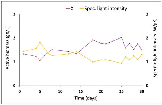 Characterization of the PPB semi-continuous reactor during the working period: evolution of the biomass concentration and specific light intensity of the phototrophic purple bacteria culture.