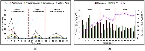 Characterization of the PPB semi-continuous reactor during the working period: (a) trend of the VFA concentration; (b) evolution of the PPB polymer content (PHA and glycogen) and the composition of PHBHV in terms of HV content.