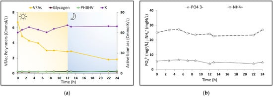 To clarify the metabolism occurring during the PPB operation, three cycles were monitored, and the culture behavior on day 18 is shown in Figure 3. During a cycle of the selection reactor, it can be observed that the culture grew, and the total amount of VFAs present in the RP solution was almost linearly consumed (Figure 3a) but was not exhausted, with soluble COD also being present as previously mentioned, maintaining the PPB in a feast regime. The average value of the VFA uptake rate from three selection reactor cycles was 0.23 ± 0.02 Cmol VFA/CmolX d, and the phosphate and nitrogen consumption rates were equal to 1.7 ± 0.4 mgP/gX d and 97.0 ± 11.7 mgN/gX d. Unlike the carbon source, nutrients (Figure 3b) were mostly consumed (by considering the daily supply—PLR and NLR reported in Section 4.2), with a consumption equal to 2.38 ± 0.1 mgP/Ld and 144.6 ± 2.5 mgN/Ld, in agreement with the known capability of PPB to remove nutrients, showing the potential for the integration of this process within a strategy of nutrient resource recovery.
