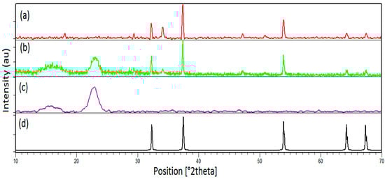 XRD patterns of (a) CaO, (b) CNC/CaO, and (c) CNC and (d) the standard reference pattern of CaO (JCPDS 00-02-1088).