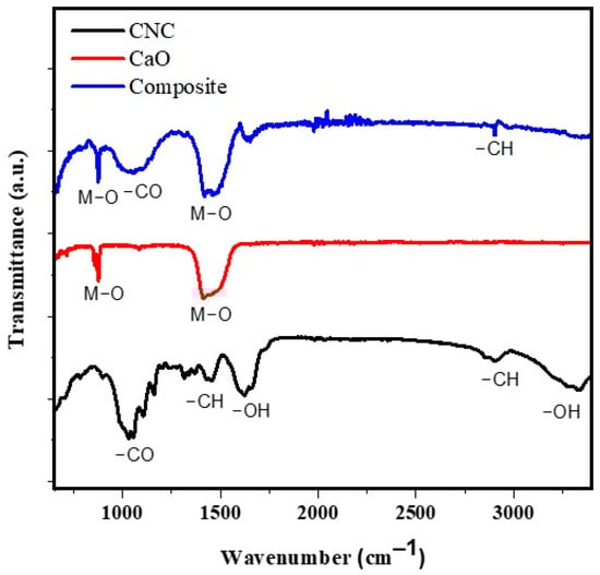 The vibrational bands contained in CaO nanoparticles, CNC, and the CaO/CNC composite in the region of 4000–400 cm−1 were examined using the FTIR technique (Figure 2). The peak in the range of 500–450 cm−1, due to the M–O bond present in CaO nanoparticles, as reported earlier, and the peak at 874 and 1418 cm−1 corresponding to the C–O bond, suggesting the carbonation of calcium oxide, were both seen in the spectra of CaO [26,27]. Peaks in CNC include the following: –OH stretch (3600–3200 cm−1), C–H stretch of cellulose polysaccharides (2910 cm−1), –OH bending vibration (1640 cm−1), CH2 bending (1430 cm−1), and 1372 cm−1 (CH3 bending), and –CO stretching (1060). Each of the positive detected peaks is in conformity with the published literature [28]. The peaks at 874 and 1418 cm−1 in the composite CaO/CNC FTIR spectrum are caused by CaO nanoparticles, which are not present in the CNC spectra. The peak of calcium oxide’s carbonation coincided with the CH3 and CH2 bending vibrations in CaO/CNC, which are in the range of 1450–1300 cm−1. These all provide confirmation that the CaO/CNC composite was successfully formed.