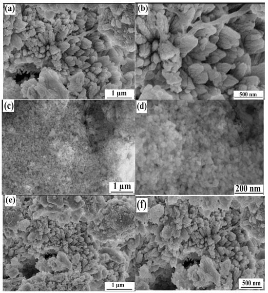 SEM images of (a,b) CaO, (c,d) CNCs, and (e,f) composite CaO/CNC at different resolutions.