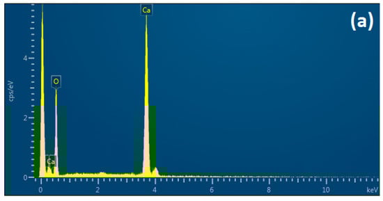 Scanning Electron Microscopy (SEM) and EDX for elemental analysis were used to examine the surface morphology of the produced materials including CaO, CNC, and CaO/CNC, as shown in Figure 3. Because of their polarity and electrostatic attraction, CaO nanoparticles have a smooth, regular, and flower-like appearance in their micrographs (Figure 3a,b). The CNC micrographs exhibit agglomeration and spherical particles (Figure 3c,d). Because of the presence of CaO and CNC, the composite displays porous nanoflakes and agglomerated particles of various sizes (Figure 3e,f). CaO, CNC, and CaO/CNC composite elements underwent EDX investigation. The purity of CaO NPs and the existence of C and O in cellulose are both confirmed by the presence of Ca and O in CaO nanoparticles. The presence of Ca, O, and C in the EDX spectrum effectively verifies the production of the composite CaO/CNC (Figure 4).