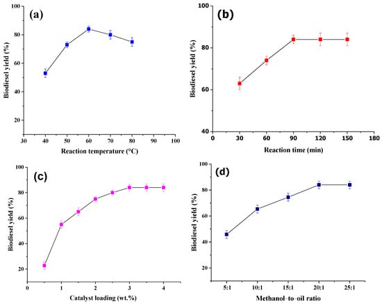 Effects of various transesterification reaction parameters on biodiesel yields: (a) reaction temperature, (b) reaction time, (c) catalyst loadings, and (d) methanol-to-oil molar ratio.