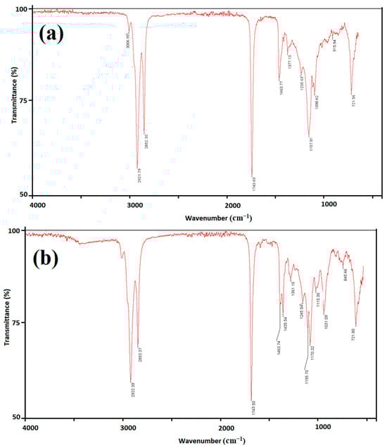 The identification of chemical bonds and functional groups in oil and biodiesel is carried out using this excellent method of analysis. Peaks are attained in the 400 to 4000 cm−1 range. The chemical structures of the FTIR spectra of the waste cooking oil and waste cooking oil biodiesel results are similar (Figure 6). However, small differences are observed in the intensities and frequencies of the absorption bands [4,9]. The presence of fatty acid methyl esters is responsible for the following peaks in waste cooking oil: 3006.9 cm−1 (sp2 C–H stretch), 2921.7 cm−1 (sp3 C–H stretch), 1377.1 cm−1 (CH3 bending), 1463.7 cm−1 (CH2 bending), 1098.6 cm−1 (C–C stretch), and 1743.6 cm−1 (C=O stretch). With some small variations, similar peaks were seen in the produced biodiesel. It is notable that the methyl ester deformation peak, which appears at 1435.5 cm−1 in the spectrum of biodiesel, is absent from the oil spectrum, which is the methyl ester group with its deformation vibration. In addition, the biodiesel spectrum’s fingerprint area peak at 1157.8 cm−1 was divided into two peaks at 1170.3 and 1195.7 cm−1. The averaging of the energy over the triple ester group of the triglycerides is gone, which strongly supported the manufacture of biodiesel. These vibrational bands show that the heterogeneous catalytic transesterification event, which turns oil into biodiesel, has taken place.