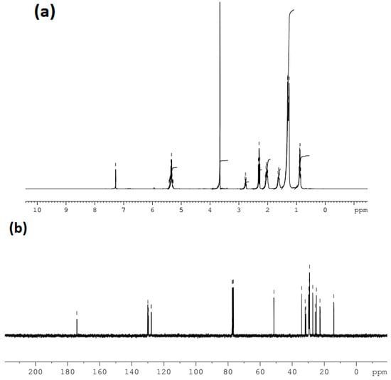 NMR spectra of (a) 1H and (b) 13C for biodiesel produced from waste cooking oil.