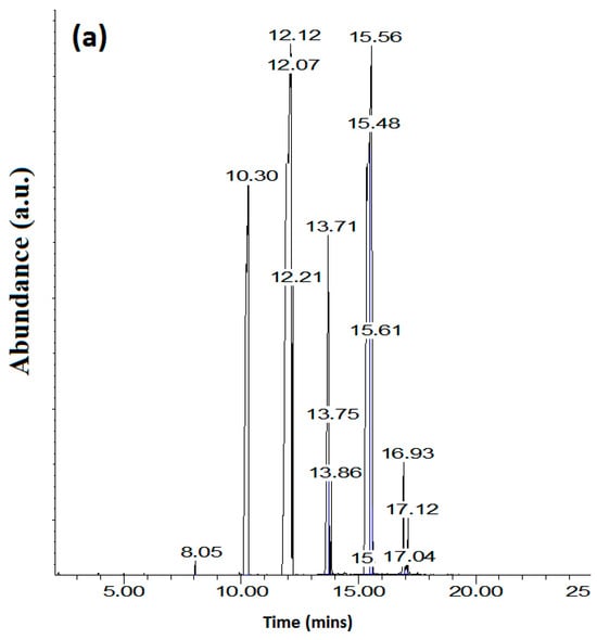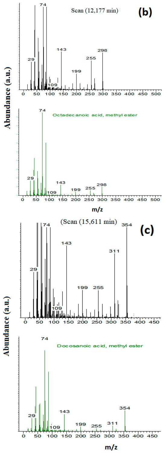 GC-MS chromatograms. (a) Total ion chromatogram of biodiesel, (b), Library match of peak at 12,177 min (octadecanoic acid methyl ester (C18:0)), and (c) Library match of peak at 15,611 (docosanoic methyl ester (C22:0)).