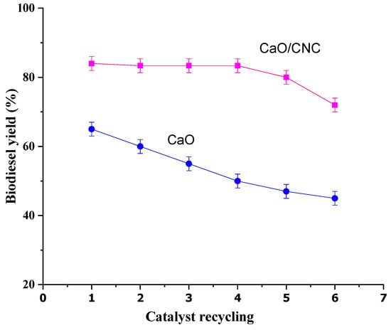 After the esterification of FFAs in the waste cooking oil was reduced to less than 0.5%, the CaO/CNC catalyst was used to produce biodiesel from esterified waste cooking oil. The transesterification reaction was performed using 30 mL of esterified oil for 90 min at 60 °C with a methanol-to-oil molar ratio of 20:1 and 3% CaO/CNC catalyst. Biodiesel and glycerol were produced during the transesterification reaction. Excess methanol was evaporated using a rotary evaporator, and the glycerol and biodiesel layers were separated using a separating funnel. The yield of biodiesel was estimated using the following equation, as per previously reported studies [11,13,30]:
