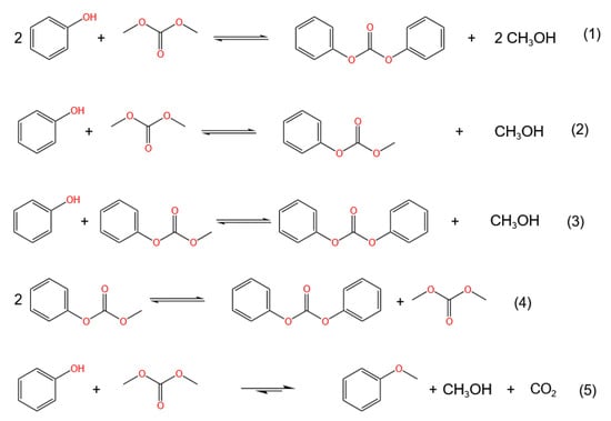 - Sun, W.; Shao, J.; Xi, Z.; Zhao, L. Thermodynamics and kinetics of transesterification reactions to produce diphenyl carbonate from dimethyl carbonate catalyzed by tetrabutyl titanate and dibutyltin oxide. Can. J. Chem. Eng. 2017, 95, 353–358. [Google Scholar] [CrossRef]