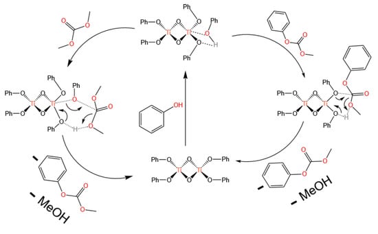 The most commonly used titanium-based catalysts are titanium alkoxides. The catalytic activity of titanium alkoxides can be adjusted by the flexibility of their alkyl chains. Wang et al. [] compared the activity between titanium tetrabutoxide and titanium tetraphenolate and found that titanium tetrabutoxide had better activity. This is because of the stronger electron-donating ability of butyl, making titanium tetrabutoxide more electron-donating, which is more conducive to the coordination between carbonyl and Ti(IV) and the transfer of electrons to metal ions. The authors proposed the reaction mechanism of titanium alkoxides, as shown in Figure 2. When the carbonyl group on dimethyl carbonate binds to Ti(IV) in the catalyst, electrons are transferred to Ti(IV), and the carbonyl group is polarized, making its carbon atom more susceptible to the nucleophilic attack of phenol. After coordinating with phenol, a four-membered ring transition state is formed, and then the C-O bond breaks to form an O-H bond, producing MPC and methanol. Finally, the carbonyl group dissociates from Ti(IV), completing a catalytic reaction cycle. It can be seen that the strength of the coordination between the carbonyl group and Ti(IV) determines the reaction activity.