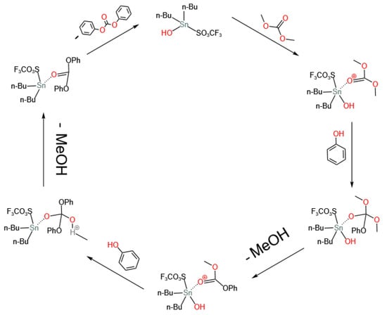 Subsequently, researchers conducted various modifications on dibutyltin oxide. Kim et al. [] found that adding alkyl or aryl sulfonic acids as additives to dibutyltin oxide can significantly increase its activity and reduce the selectivity of anisole. On the basis of 19F MAS NMR and 119Sn MAS NMR [], they believed that, in the presence of phenol, dibutyltin oxide interacts with triflic acid to form active tin complexes containing triflic acid ligands. Therefore, the enhancement of the activity of dibutyltin oxide in the presence of alkyl or aryl sulfonic acids can be attributed to the formation of sulfonic acid-bonded tin, and its structure as [Bu2Sn(OH)(OTf)]2 and [Bu2Sn(OAc)(OTf)]2 was confirmed by single-crystal X-ray diffraction. The catalytic reaction mechanism was provided and is shown in Figure 8. The enhancement by aryl sulfonic acid is attributed to its electron-withdrawing property, which enhances the Lewis acidity of Sn(IV).