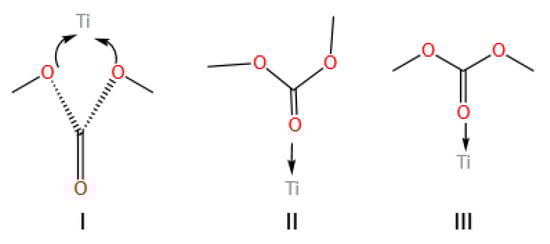 - Wang, S.; Chen, T.; Wang, G.; Cui, C.; Niu, H.; Li, C. Influence of coordination groups on the catalytic performances of organo-titanium compounds for disproportionation of methyl phenyl carbonate to synthesize diphenyl carbonate. Appl. Catal. Gen. 2017, 540, 1–6. [Google Scholar] [CrossRef]
