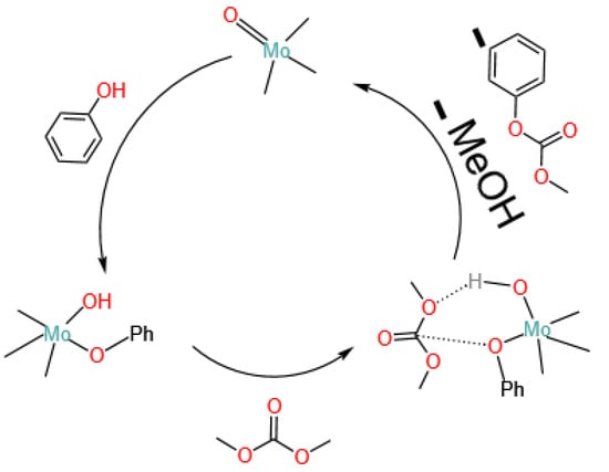 Mo-based catalysts are effective for transesterification, such as the transesterification of dimethyl oxalate with phenol. Therefore, Mo-based catalysts have also been used for the transesterification of dimethyl carbonate with phenol. The activity of heterogeneous Mo-based catalysts reported in the literature is listed in Table 9.