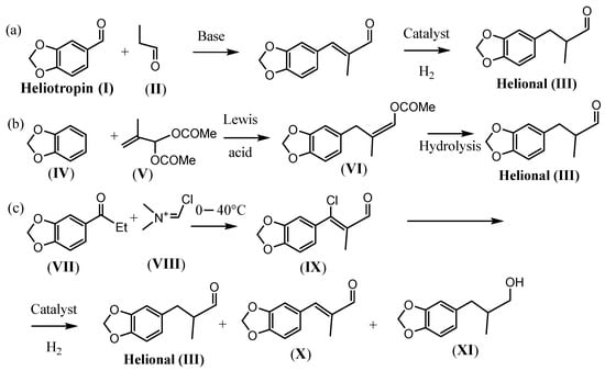 Main protocols for the synthesis of Helional® (III). (a) preparation by crossed-aldol condensation; (b) preparation by alkylation of 1,2-methylenedioxybenzene (MDB); (c) preparation by Vilsmeier reaction and hydrodechlorination.