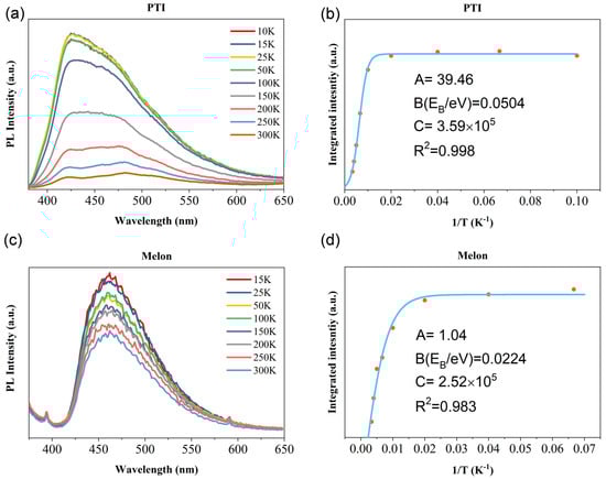 (a,c): Temperature-dependent PL spectra of PTI/Li+Cl− and melon. (b,d): fitting process of of melon and PTI applying Equation (2), the blue line is the fitted curve and the scatter points were selected from the peak values of PL data at different temperatures.