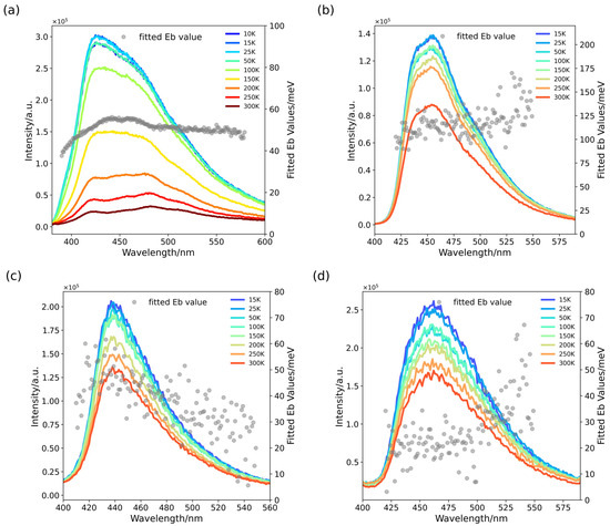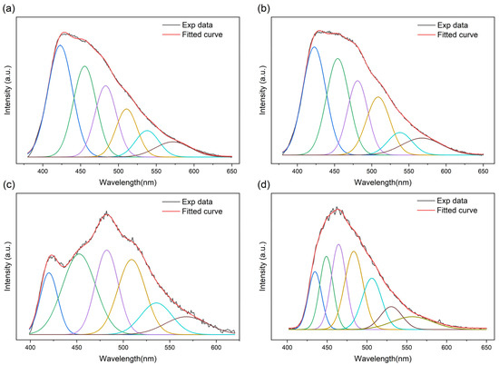 The deconvolution of the photoluminescence curve at varying temperatures is collected and shown by several Gaussian–Lorentz functions to investigate the component of the fluorescence emission peaks. As can be seen, the PL spectra contain various emission features: the major composition peaks are chosen to be narrow and share the same half-peak breadth, since the width of the peak indicates a mixture of multiple recombinations. The PTI/Li+Cl− emission center is observed at P1 (420 nm, ~2.9 eV), P2 (450 nm, ~2.7 eV), P3 (480 nm, ~2.6 eV) and P4 (509 nm, ~2.43 eV) (Figure 3), which mainly originate from the three different pathways of transition: π*-π, π*-σ and π*-n to non-bonding orbitals (n) [14,15]. The components of the band pairs with an energy gap corresponding to the wavelength of the wave function shapes (Figures S2–S4) as well as the typical emission peaks (Figures S5–S9) are listed. The shape change in the spectrum with the variation in temperature provides information to distinguish free excitons from bound excitons. As shown in the figure, the shoulder at 420 nm becomes progressively weaker with the increase in temperature, which points to the signature of the quenching of bound-state excitons [16,17].