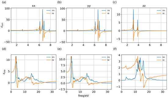 Dielectric function of PTI/Li+Cl− along major axis of primitive cells. (a–c) The dielectric contribution of the ionic effect. (d–f) The dielectric contribution of electric density.