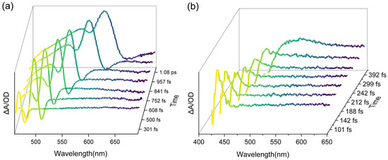 ΔA vs. the wavelength plot for different times after the light pulse; time zero corresponds to the maximum overlap of the excitation and the probe pulse. (a) Photobleaching process of melon; (b) photobleaching process of PTI/Li+Cl−.