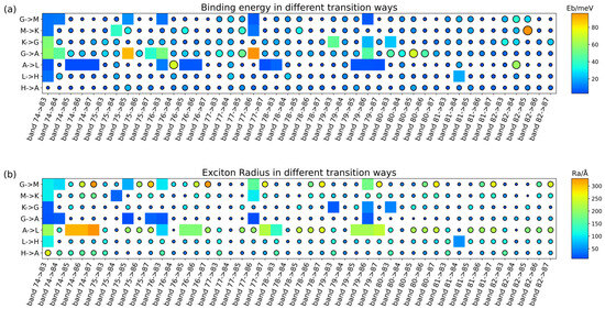 (a) Binding energy of different transition way, (b) exciton radius of different transition ways. All marked exciton binding energies and corresponding exciton radius values of PTI/Li+Cl− within the transition energy range. The circular marks in the heatmap indicate the transition mode that does not satisfy the two screening conditions of TDM and experimental excitation energy, and the square colored blocks indicate the results that pass the screening.