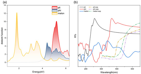 Carbon nitride is a novel polymeric semiconductor in the field of photosynthesis [1,2]. However, the poor understanding of its formation process and long-range structure has limited researchers to purposefully controlling and modifying the reactivities of these materials, as well as making the theoretical simulation deviate from the experiment results [3,4]. Two relatively convincing carbon nitride structures, respectively containing two typical building blocks, have generally been explored in the literature: heptazine-based amorphous polymeric carbon nitride (melon) and triazine-based highly crystalline structure poly(triazine imide) (PTI/Li+Cl−) [5,6,7] (Figure S1). During the photoresponse procedure, light absorption is the very first step including the intrinsic absorption of the non-excited state and the exciton absorption. The relatively free motion of interrelated electron–hole pairs can be described as neutral quasiparticles using the effective mass approximation in the Schrodinger equation. The Coulomb binding between them will lower the overall energy of the system, which usually performs as impurity doping of energy levels within the band gap. Therefore, the experimentally measured optical bandgap (denoted as ) is generally slightly smaller than the electronic band gap (denoted as ):