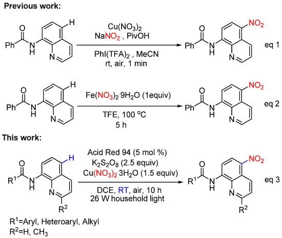 The auxiliary-assisted C–H functionalization has become a reliable and robust tool in modern organic synthesis in recent years [,,,,,,,,,,]. Specifically, the direct functionalization of quinoline ring at the C5 position using the amide unit as a directing group has also been explored in recent years [,,,,,,,,,,,], and the nitration of C5 quinoline ring has especially received considerable attention [,,,,,,,,,,,]. Recently, the Ribas group described a mild methodology for C–H nitration of 8-aminoquinoline amides utilizing Co(NO3)2·6H2O as the catalyst and tBuONO as the nitrating agent []. However, it tended to suffer from regioselectivity for quinoline rings (ratio of C5:C7 = 3:1). Subsequently, the Zhang group developed the copper-catalyzed nitration of 8-aminoquinolines at C5 position using Cu(NO3)2/NaNO2/PhI(TFA)2 as the nitration system (Scheme 1, eq 1) []. Recently, Fan also reported an alternative transformation with Fe(NO3)3·9H2O as the nitro source [], albeit this protocol should be performed at 100 °C (Scheme 1, eq 2). Despite these achievements attained in this area, these synthetic routes still require expensive oxidants, expensive metals, or a high reaction temperature. Therefore, the development of a mild and environmentally benign route to synthesize nitro compounds is highly desirable.