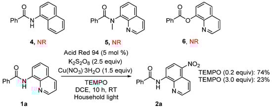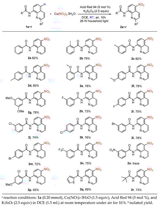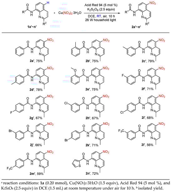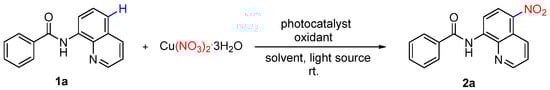 Initially, the reaction of N-(quinolin-8-yl)benzamide (1a) was performed as the model reaction to optimize the reaction parameters at room temperature under air as Scheme 2, and the results are displayed in Table 1. After various catalysts, solvents, and oxidants were investigated (see Supporting Information), the desired product 2a was obtained in 68% yield in DCE using K2S2O8, Cu(NO3)2·3H2O, and Eosin B as the oxidant, the nitrating agent, and the photoredox catalyst, respectively (Table 1, entry 1) []. Thereafter, various photocatalysts were checked, and Acid Red 94 could produce the product in a good yield of 82% (Table 1, entry 7 vs. entries 2–6). However, reducing the amount of Acid Red 94 from 5 mol % to 4 mol % resulted in a lower yield of 68% (Table 1, entry 8 vs. entry 7). Additionally, performing reaction under a nitrogen or an O2 atmosphere did not afford better results (Table 1, entries 9 and 10 vs. entry 7). When the reaction time decreased to 8 h, a lower yield of 73% was observed (Table 1, entry 11 vs. entry 7). And the conditions in entry 7, Table 1 was selected as the optimized reaction conditions.