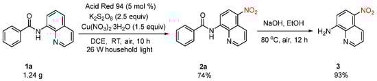 In order to prove the synthetic value of this method, we performed a gram-scale reaction (Scheme 5), and the nitrated product 2a was isolated in 74% yield. Furthermore, the obtained product 2a could be easily transformed into 5-nitro-8-aminoquinoline 3 in a yield of 93% via a hydrolysis process.
