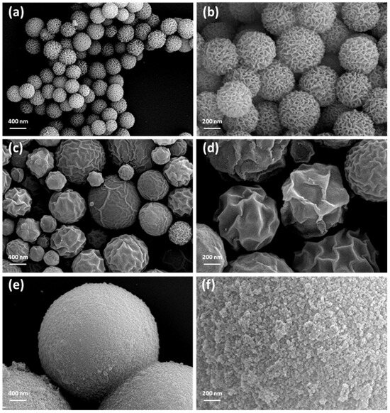 SEM images reveal the morphologies of three distinct SiO2 supports (Figure 1). The typical morphology of layered dendritic mesoporous silica (DMS) is observed in Figure 1a,b. The DMS support was uniformly prepared with spherical particles averaging a submicron size, exhibiting a well-developed hierarchical macro–mesoporous nanostructure on the surface, as further confirmed by BET analysis. Spray EISA silica exhibits surface wrinkles, with a particle size of approximately 741 nm, larger than that of DMS (Figure 1c,d). Conversely, oven EISA silica lacks surface wrinkles, featuring macrometer-sized particles (Figure 1e,f). It exhibits a unique morphology characterized by interconnected dendritic-like structures with mesoporous channels. These structures resemble tree branches or fractal-like patterns.