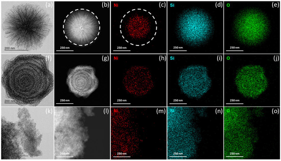 TEM (a,f,k), HAADF-STEM (b,g,l), and EDX mapping (c–e,h–j,m–o) images of reduced Ni/DMS, Ni/spray EISA, and Ni/oven EISA.