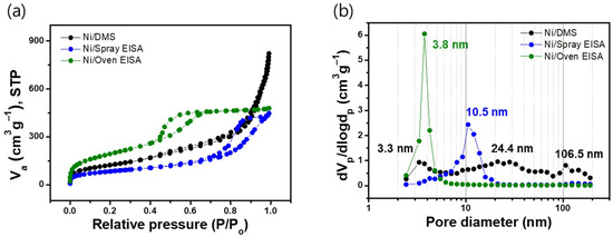 (a) N2 adsorption/desorption isotherms and (b) BJH pore size distribution of the reduced Ni/DMS, Ni/spray EISA, and Ni/oven EISA.