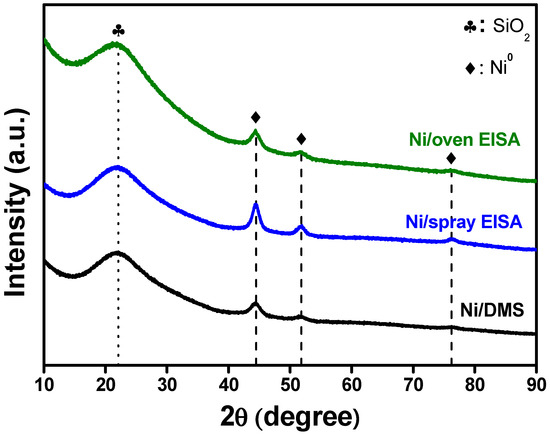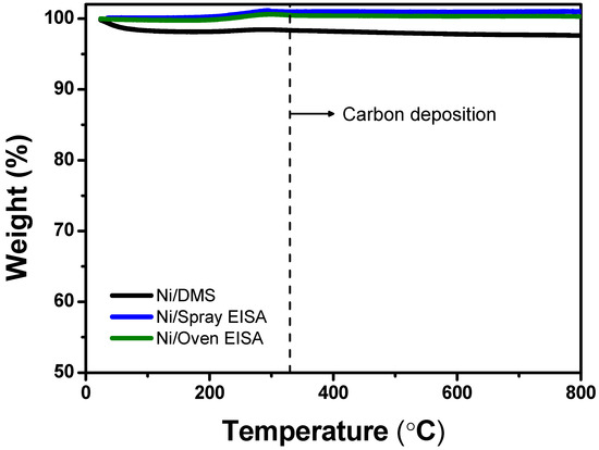 The as-prepared silica supports were processed through the Ni precursor impregnation using ethylene glycol as a solvent, according to the literature reported elsewhere with slight modification [21,28]. Briefly, 0.19 g nickel nitrate hexahydrate (Ni(NO3)2∙6 H2O ≥ 98%, Samchun Pure Chemical Co., Ltd. Republic of Korea) and 0.5 g DMS, spray EISA, or oven EISA were dissolved in 10 mL ethylene glycol (C2H4(OH)2 ≥ 99.5, Tokyo Chemical Industry Co., Ltd. Japan), stirred overnight at room temperature, and dried in a vacuum at 80 °C until the solvent was completely evaporated. Lastly, the obtained product was calcined at 550 °C for 6 h in an air atmosphere. The resulting catalysts were indicated as Ni/DMS, Ni/spray EISA, and Ni/oven EISA. All three samples were reduced at 800 °C for 2 h under a 5% H2/Ar atmosphere before reaction testing to obtain metallic nickel active catalytic sites.