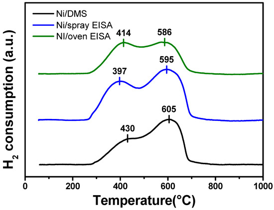 Another crucial factor contributing to the high stability of catalysts is the strong metal–support interaction (SMSI). This strong interaction plays a pivotal role in preventing Ni sintering during the DRM reaction, maintaining long-term catalytic activity with high stability. To assess the reducibility of metal-oxide-based supported catalysts and the degree of interaction between the active phase and support, the reduction behavior of three catalysts was investigated using H2-TPR analysis (Figure 5), and the H2 consumption of these catalysts was quantified (Table 3). The main H2-TPR peaks observed for Ni/DMS, Ni/spray EISA, and Ni/oven EISA catalysts appeared as dual peaks at 430 °C/605 °C, 397 °C/595 °C, and 414 °C/586 °C, respectively. These two distinct reduction peaks could be ascribed to the reduction in NiO species localized in different environments [20]. The peaks at lower temperatures (430 °C, 397 °C, and 414 °C) are attributed to the reduction in bulk-phase NiO grafted onto the external surface, exhibiting higher reducibility. Meanwhile, the peaks at higher temperatures (605 °C, 595 °C, and 586 °C) are attributed to the small NiO particles embedded within the mesopores, demonstrating lower reducibility [21]. In comparison to the Ni/spray EISA and Ni/oven EISA, the reduction peaks of the Ni/DMS sample were observed at higher temperatures, suggesting lower reducibility of NiO species over Ni/DMS compared to the Ni/spray EISA and Ni/oven EISA. However, the larger peak area observed at higher temperatures for Ni/DMS in comparison to the other two catalysts indicates a stronger metal–support interaction. This suggests that hierarchical opened pore structure of DMS silica has a superior ability to confine Ni particles compared to the closed pore structure supports such as spray EISA silica and oven EISA silica.