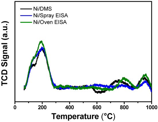 H2-TPR properties of calcined Ni/DMS, Ni/spray EISA, and Ni/oven EISA.