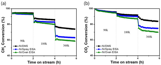 Catalytic performance of Ni/DMS, Ni/spray EISA, and Ni/oven EISA for DRM at 800 °C, tested for 2 h each with gas hourly space velocities (GHSV) of 90, 180, and 360 L gcat−1 h−1: (a) CH4 conversion; (b) CO2 conversion.