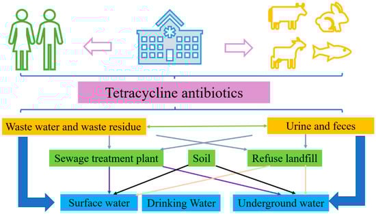 The use of antibiotics in China accounts for about half of the antibiotic use in the world []. Tetracycline antibiotics are widely used because of their broad spectrum of action, high efficiency, and low cost. Because of the abuse of antibiotics by human beings, antibiotics are discharged into the environment in the form of medicines and metabolites. Tetracycline antibiotics are ubiquitous in the water environment because of their strong hydrophilicity and low steam pressure, and they are easily soluble in water. Figure 1 shows the sources of tetracycline antibiotics in the water environment.
