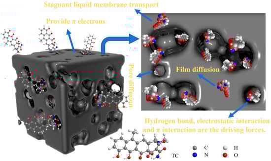 Adsorption removes tetracycline antibiotics by transferring them to the adsorbent by π-interactions [], electrostatic interactions [], and hydrogen bonding []. The adsorbent surface forms a zone with low potential energy and high molecular density near the surface [,]. There are four steps in the adsorption of tetracycline antibiotics: transport through the stagnant membrane near the adsorbent, diffusion across the membrane, diffusion through the pores, and adsorption [,]. The mechanism by which adsorption removes tetracycline antibiotics is shown in Figure 2.